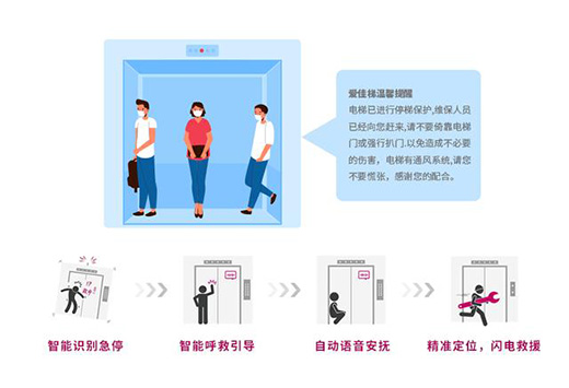 愛佳梯5G邊緣計算終端可以智能識別電梯急停困人,并主動詢問,確保準確無誤。及時播放提示音,被困乘客可通過敲擊轎廂門指定位置或大聲呼叫進行報警(采用5G NBIoT物聯網專用通信,確保信號快速發出)同時還會進行語音安撫,緩解被困乘客焦慮情緒、防止不當自救造成二次傷害。