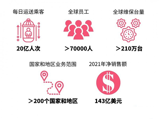 奧的斯的身影幾乎遍布全球大都市,這家成立于1853年歷史悠久的電梯業巨頭,每天在全球運送乘客約20億人次,擁有超過7萬名員工,維保電梯和自動扶梯超210萬臺,規模居行業之首。2021年,奧的斯的業務范圍覆蓋全球超過200個國家和地區,凈銷售額達143億美元。