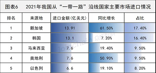 2021年我國從“一帶一路”沿線國家進口醫療器械商品總額達80.07億美元,同比增長20.6%。主要進口國家為新加坡、韓國、馬來西亞、奧地利、以色列等地。新加坡的進口額最高,為13.9億美元,同比增長61.4%,占比為17.4%。
