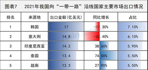 2021年我國向“一帶一路”沿線國家出口醫療器械商品總額達241.1億美元,同比下降24.4%。主要出口國家為韓國、意大利、印度尼西亞、泰國、越南等地。韓國是出口額最高的國家,為17億美元,同比下降17.3%。