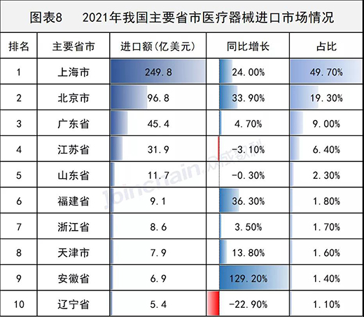 從全國進口海關口岸的貿易數據來看,2021年上海市、北京市、廣東省醫療器械進口規模位列全國前三。其中上海市進口額達249.8億美元,同比增長為24.0%,占比達49.7%,北京市和廣東省緊隨其后,進口金額和占比分別為96.8和45.4億美元,19.3%和9.0%。