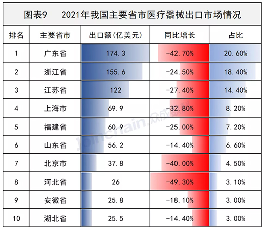 從全國出口海關口岸的貿易數據來看,廣東省是我國醫療器械2021年出口額最高的省份,達174.3億美元,同比下降42.7%,全國占比20.6%。浙江省和江蘇省位居第二、第三,出口金額分別為155.6億美元和122億美元,同比下降24.5%和27.4%,占比分別為18.4%和14.4%。