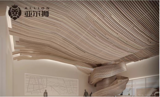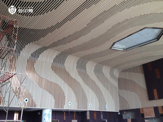 亞爾獅鋁制品定制專業的設計人員根據裝修空間及工程要求,打造吊頂波浪弧形鋁方通和木紋鋁方通,線條明快飄逸,層次分明,堅固耐用。鋁方通吊頂使長形空間不再因為距離而產生局促感,簡潔而不呆板,充足的光感與次序感,更使空間充滿時尚氣息。