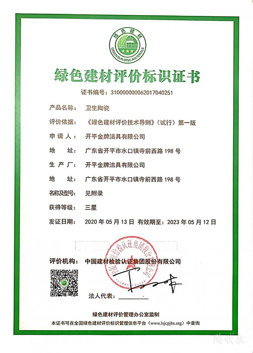 經綠色建材評價機構對金牌產品的原料供應、產品生產過程等方面嚴格評審下,最終認定金牌衛浴產品在節能、減排、安全、便利及可循環方面均符合綠色發展方向,金牌衛浴成功斬獲三星級綠色建材評價標識證書。