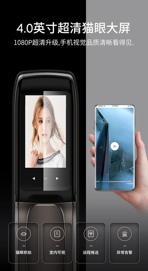 除了以上功能,希箭智能鎖R10流線型外觀上,還有一塊4.0英寸超清貓眼大屏最引人注目,1080P超清畫質讓您在屋內就可以把門外情況看得清清楚楚,安心又省心。