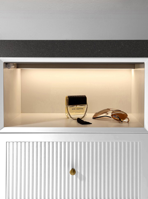 開放式儲物格,內(nèi)嵌感應(yīng)燈帶,于冷靜的白灰空間,注入活潑的暖色燈光作為點綴,在增加觀賞性的同時提高生活效率,豐富空間層次,帶來個性的情緒表達。