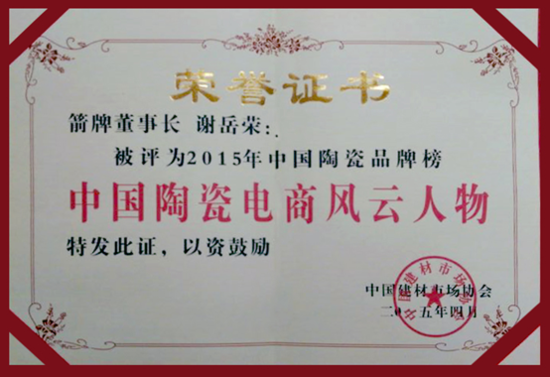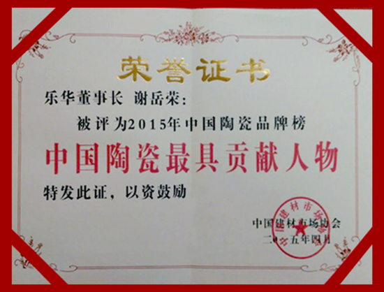 2015年4月21日,由中國陶瓷新聞網和佛山陶瓷網聯合發起,中國建材市場協會主辦的2015“中國陶瓷品牌榜”頒獎盛典在廣東省佛山市禪城區中國陶瓷產業總部基地陶瓷劇場3樓多功能會議中心隆重舉行。據悉,本次評選活動歷時半年之久,采用網絡投票形式,實行微信一人一票制度,過程公正而且嚴格。經過激烈的投票角逐,樂華集團董事長謝岳榮先生獲得了“2015年中國陶瓷品牌榜——中國陶瓷最具貢獻人物”以及“2015年中國陶瓷品牌榜——中國陶瓷電商風云人物”獎項。