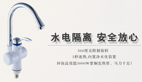 電熱水龍頭產品具有快速(3-5秒鐘出熱水);方便(無須專人安裝、即開即熱、冷熱兩用、溫度流量可調);安全(無水自動斷電、水電分離設置);節能環保(省水省電、無污染);美觀(時尚設計、家居裝飾);小巧(不占空間);多功能(磁化、凈化);經濟實惠(相比熱水器或是其他的電加熱裝置)等特點,是現代家庭生活必備的廚衛小家電用品。