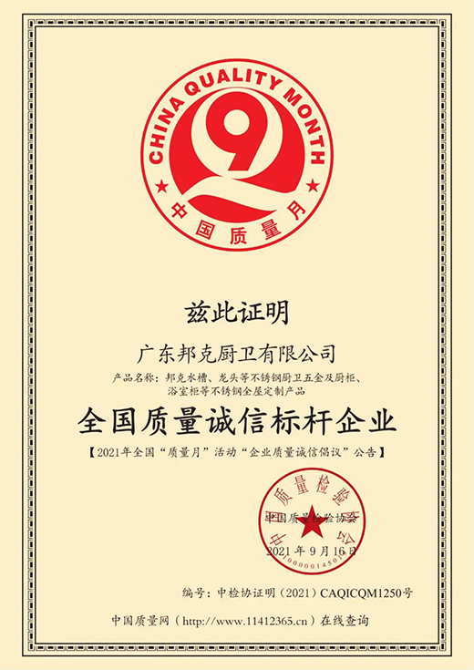2021年9月,由國家市場監督管理總局、中共中央宣傳部、國家發展和改革委員會等20個部門聯合開展以“深入實施質量提升行動,大力推進質量強國建設”為主題的全國“質量月”活動。憑借出眾的產品服務質量、有口皆碑的品牌實力,邦克廚衛從眾多企業當中脫穎而出,再度榮膺中國質量檢驗協會“全國質量誠信標桿企業”稱號。
