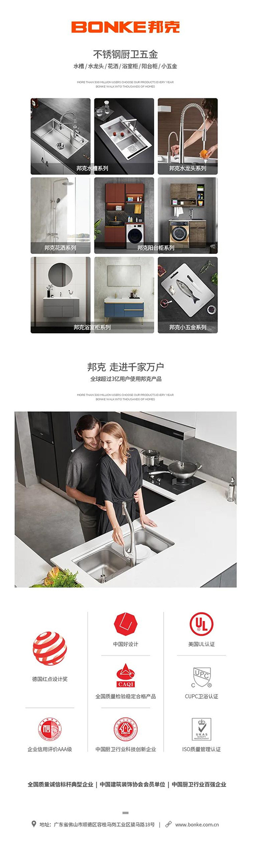 作為不銹鋼五金行業的領導品牌,邦克敏銳地洞察到家居五金高端定制化、智能化的消費升級趨勢,以科技與時尚為導向,堅持高品質高性能、高審美價值、高端定制化服務的產品和服務,開啟智能化家居五金生活。