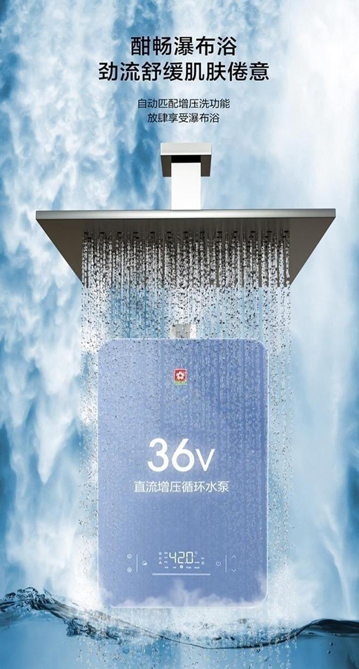 該款熱水器除了具有零冷水即開即熱的特點外,還輕松幫你實現“大水量自由”。36V直流增壓循環水泵自動匹配增壓洗功能,讓你暢享瀑布浴,讓勁爽水流充分舒緩疲倦身心,煥活每一寸肌膚、每一個細胞。