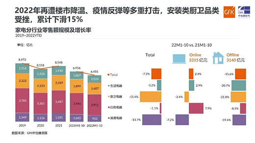 2022年對于家電市場又是一場攻堅戰,在疫情反復、房地產震蕩、消費者心態趨于保守、整體市場不振等諸多內外因素夾擊下,2021年的大反彈未能延續。根據GfK中怡康測算,2021年,中國家電市場零售額同比增長了5.3%,但2022年1~10月,零售額規模已同比下滑7.2%。其中廚衛電器尤為突出,零售額同比下滑15.4%,行業高地遭遇大挑戰,且雙線都呈現負增長,線下跌幅高達21.8%。
