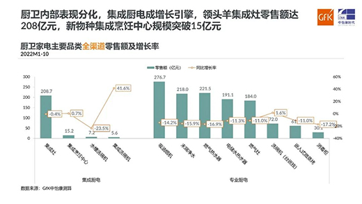 廚衛電器遭遇挑戰,內部品類分化明顯。發展時間較長、較為成熟的油煙機、燃氣灶、熱水器等專業廚電產品出現了零售額大幅同比下滑。2022年1~10月,油煙機零售額同比下滑14.2%,燃氣灶下滑11.0%,燃氣熱水器下滑16.9%,降幅基本都大于行業平均水平。作為行業發展新引擎的集成廚電則在不斷發展壯大,從目前數據看,包括集成灶、集成烹飪中心、水槽洗碗機、集成洗碗機等品類在內,集成廚電規模已經達到237億元,在廚衛電器內部占比達到了15%。其中,集成洗碗機零售額同比漲幅達到41.6%,表現優異;集成灶零售額保持穩定,規模達209億元,位列廚衛電器行業第四位,相信隨著后期疫情的解封和管控政策變化,壓抑的需求會再次釋放,品類將迎來利好。