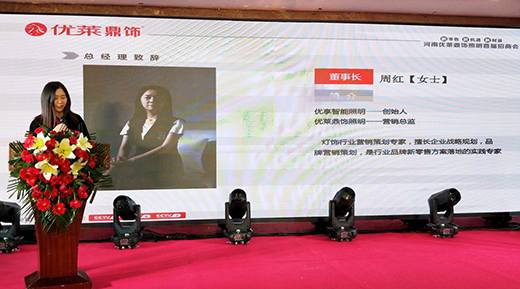最后,優享智能照明創始人、優萊鼎飾照明營銷總監周紅女士為大家帶來期盼已久的感恩回饋政策,向現場加盟商詳細解讀加盟優惠與開業支持,現場反響熱烈。優萊鼎飾照明的營銷戰略和招商政策贏得了廣大意向加盟商們的熱烈回應和認可。