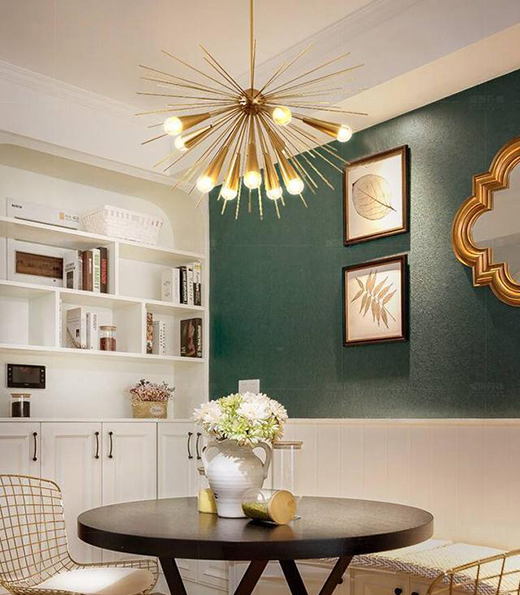 較淺色的北歐風(fēng)空間中,如果出現(xiàn)玻璃及鐵藝材質(zhì),就可以考慮挑選有類似質(zhì)感的燈具。此外,北歐風(fēng)格的裝飾中有很多幾何元素,燈飾也不例外,例如將一根根金屬連接鑄造成各種幾何形狀的燈具,中間簡單地鑲?cè)胍槐K白熾燈,可打造出極簡的北歐風(fēng)格。