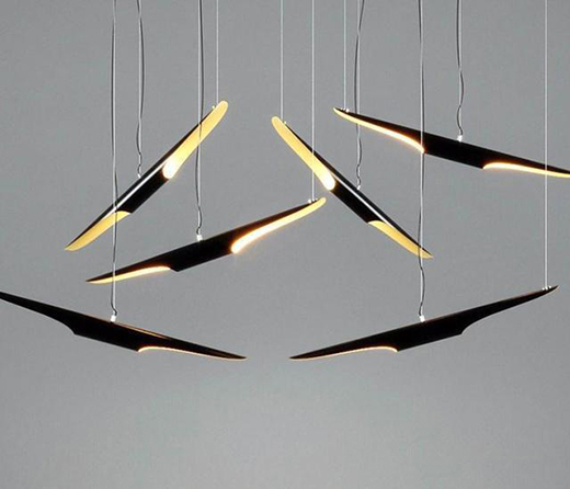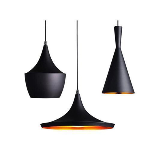 樂器吊燈是設(shè)計(jì)師從印度制作的黃銅容器獲得靈感設(shè)計(jì)而成,這種吊燈分為小號(hào)長錐型、大號(hào)寬廣型、中號(hào)飽滿型。以黑色燈罩居多,圓潤的亞光黑色表面與燈罩內(nèi)部的黃色組合,既神秘又熱情,令人感受到一種異域風(fēng)情。