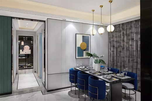 一般來說,餐廳照明以懸掛在餐桌上面的吊燈為主,柔和的光線聚集在餐桌中心,具有凝聚視覺和調(diào)節(jié)用餐情緒的作用。