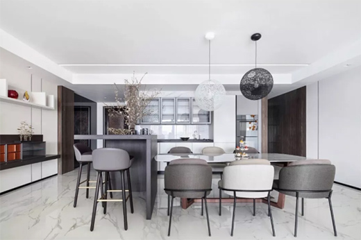 小細(xì)節(jié):和客廳一樣,餐廳吊燈懸掛的高度,燈罩和燈球的材質(zhì)與形狀要精心選擇,以免造成令人不舒服的用餐光線。