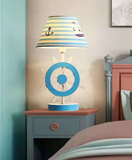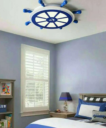 海洋主題自然少不了運用大量的海洋元素,月影燈飾的這款卡通美式船舵款吸頂燈和創意護眼床頭燈的巧妙搭配,讓整個兒童房充滿大海的韻味,滿足小男孩對航海的一切幻想。