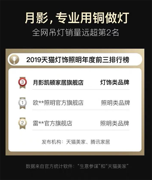 月影燈飾在2011年入駐天貓三個月后,便做到全銅燈飾銷量第一名!之后連續8年榮膺天貓全銅燈飾銷量NO.1。雙十一戰役表面是一場線上數字角逐,實際上更是一場全渠道博弈。月影燈飾自2011年落地于深圳,便開始迅速擴張,2018年起,更是全面啟動線下布局,目前線下門店已覆蓋全國主要城市。線上線下加速融合,資源優化配置。此次雙十一活動,月影燈飾更是進行全國性的戰略布局,吹響雙十一終極狂歡盛宴的進攻號角。