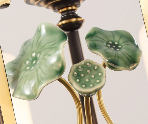 甄選手工藝打造陶瓷荷葉,色澤亮麗,富有質(zhì)感,于柔和燈光襯托下塑造荷塘月色之美。
