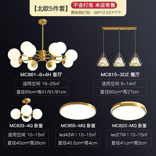 全屋銅燈套餐一共包含了客廳、餐廳、臥室在內的五盞全銅燈飾,直接幫你搞定不同居室的全屋燈飾,還有北歐、輕奢、中式、簡約、美式和歐式六款,搭配齊全,盲選都不會出錯。