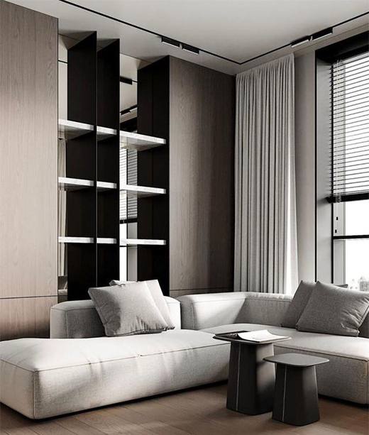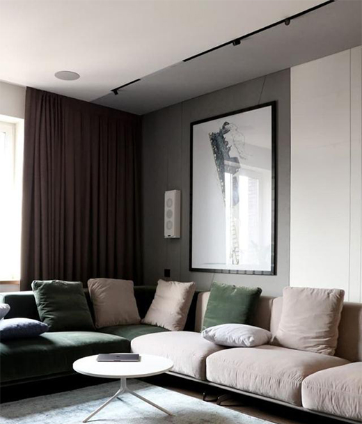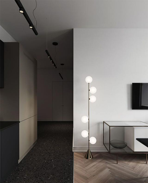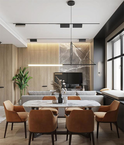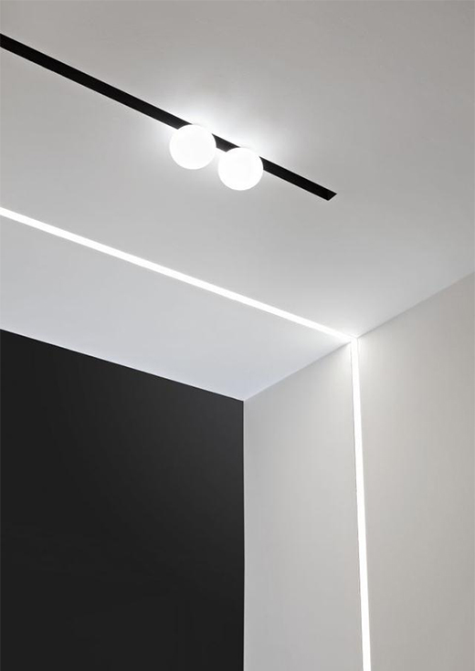 但同樣,也會讓整個空間頂部顯得空泛和單調(diào),這時安裝磁吸軌道燈,可以通過軌道線條勾勒,裝飾整個頂部,既一定程度上符合了極簡的要求,又起到了畫龍點睛的裝飾作用。