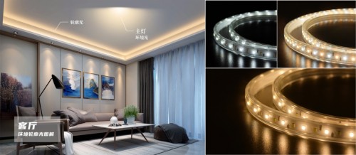 客廳作為一個家的核心區域,不同照明燈具組合也可以為客廳環境提供多種風格上的變化。環境光+輪廓光的組合是比較常見的照明布局方式,環境光為客廳提供明亮的主光源,滿足會客、日常生活需要。同時輪廓光也可以在屋主休憩時提供較為輕松的低明度照明選擇,打造家庭的溫馨感。