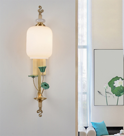 精巧的陶瓷荷葉裝飾,造型生動有趣,蓮花高潔,亭亭凈植,為空間注入文人墨客的儒雅之氣。陶瓷燒制喚醒東方歷史文化底蘊,不僅極易清潔,更能使壁燈展現風雅之姿。