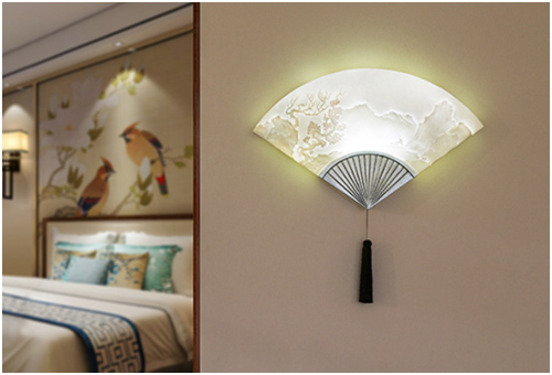 扇子造型的手工樹脂壁燈,造型新穎獨特,其扇面呈現富有詩情畫意的山水立體裝飾畫,寄情于自然山水,以文人雅興來裝點生活,清心自然,靜謐而美好,在自然中體味人生。