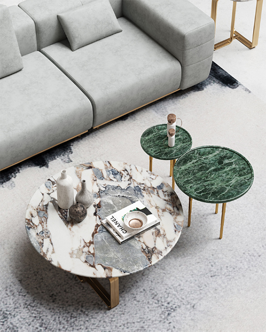 這款茶幾最大程度地協(xié)調(diào)了觀賞性與實用性,桌面采用紋路清晰多樣的大理石,著重展現(xiàn)時間的痕跡。金屬桌角采用三棱柱的形態(tài),三角支撐更加牢固,茶幾整體展現(xiàn)出穩(wěn)重奢華的特質(zhì),當有燈光照射時,便會展露出溫潤的光澤感,從而激發(fā)人們對美好生活品質(zhì)的向往。