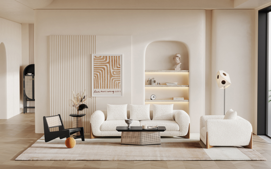 客廳,作為家居環境中出鏡率最高的地方,營造清爽宜人的客廳空間尤為重要。在客廳布置的時候,選用洛品有家侘寂系列家具。比如藤質休閑椅,置于屋內一角,搭配綠植裝飾,清新自然中又透出古樸沉穩的意境,對避暑相當有益,是休息及會客的特色空間。