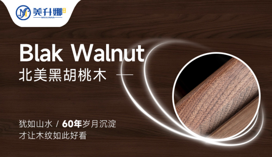 美升娜黑胡桃木系列,顏色呈現(xiàn)出淺紅褐色至棕褐色,深沉且莊重,顯得十分雅致,體現(xiàn)的是一種低調(diào)的高貴、內(nèi)斂的奢華。