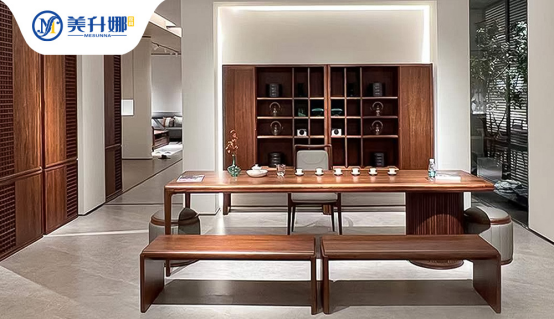 2024年,美升娜家居推出全新系列“北美黑胡桃”全屋整裝和成品家具,覆蓋客廳、餐廳、臥室、衣帽間、書房、茶室、廚房等居室,展現(xiàn)奢華高貴的家居環(huán)境,讓家像一幅流動的畫卷,美麗而富有故事。