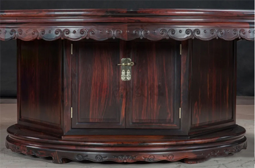 南枝紅為客戶定制圓餐桌不在少數,今天為大家分享的一套客訂頗為恢弘大勢,直徑達2.38米的圓桌,配備了12件四出頭官帽椅,為符合現代餐桌多人進食的需要,加配了轉盤。而讓人神往不已的,是全桌均使用了大紅酸枝(交趾黃檀)的芯材,細看其油性紋理,無不隱隱透著木材的在歷經了歲月洗禮下沉淀的穩固氣息。