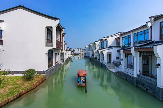 酒店更為特別之處,在于游客可乘船游河前往住處。曲水流觴,云霧彌漫,登上烏篷船,賞四周風光,將這一幅徐徐展開的山水畫卷盡收眼底。恍惚間,仿若見岸邊有一身著素色馬面裙的姑娘回眸一笑,顧盼生輝,讓本談笑風生的游客噤聲不語,唯恐驚擾了畫中之人。