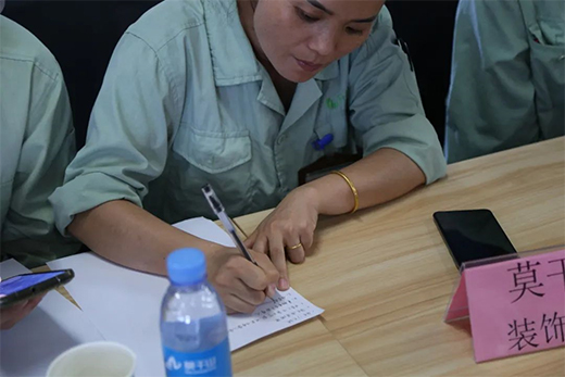 在安全培訓試講環節中,板材、地板、全屋定制、科技木公司四個小組代表自由擬定培訓主題輪流上臺作安全培訓試講。