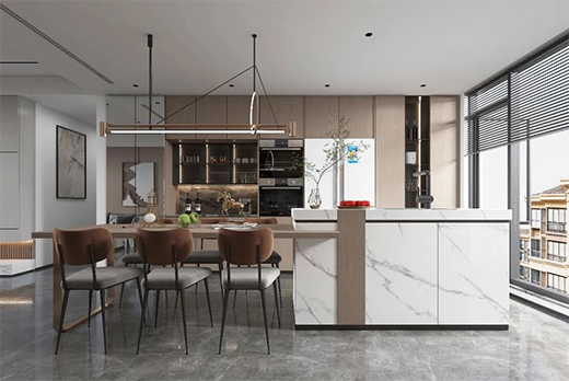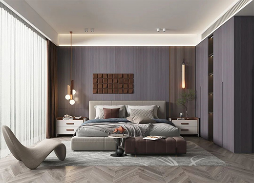 雁行意木深色肅雅,紋理爽直,深淺過渡勻而不亂。將細密折線藤紋隱于科技木間隙,如天際風云疏雅,又如雁陣成列而飛。遠觀大氣沉穩,近看秀雅工整,帶著些領頭雁式的端方持重。