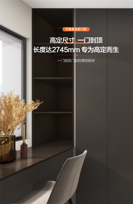 萬象健康板材ENF級高定柜門板區別行業傳統的柜門板產品,其長度達2745mm,比市面上普通產品長305mm,是一門到頂門板的理想板材,整體高端大氣、簡約美觀,呈現出與眾不同的視覺體驗。