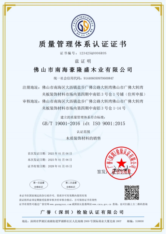 ISO9001質(zhì)量管理體系認證的通過,意味著板芝福在質(zhì)量管理上達到了國際標準。這不僅是對企業(yè)過往努力的肯定,更將助力板芝福在未來持續(xù)提供高品質(zhì)的產(chǎn)品和服務,在競爭激烈的板材市場中更具優(yōu)勢,繼續(xù)向著成為中國最具價值板材品牌的目標穩(wěn)步前行。