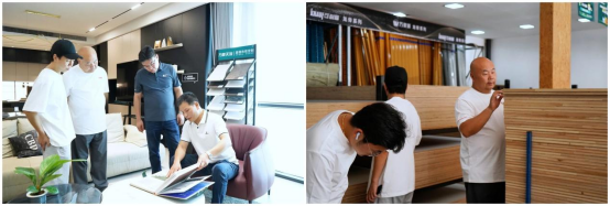 隨后,一行人前往旺德府工業園,參觀品牌自有工廠。在生產車間,大家通過觀木紋辨真偽、觸板材測質感、聞膠體驗環保的沉浸式交互,深度觸摸品質內核。