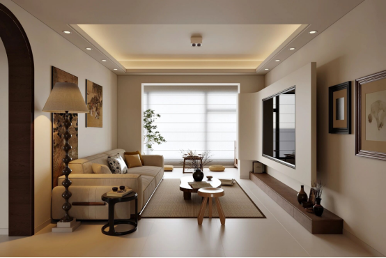 客廳電視柜:和墻面齊平的“懸浮式柜體”,把電視嵌入留白區(qū),下方做木質(zhì)地臺代替?zhèn)鹘y(tǒng)電視柜,既藏了收納,又讓視覺輕盈不壓層高。