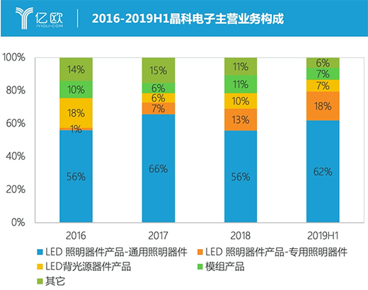晶科電子自身業績也受到沖擊。其2018年營業收入同比僅增長2.2%,遠低于前一年的49.5%;2019年上半年營收為4.19億元,同比下滑6.75%,業績承壓。從主營業務收入構成來看,其通用照明器件業務在2018年不管是營收規模還是業務占比都出現明顯下滑。