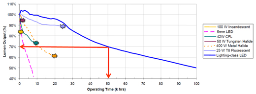 所有的傳統光源的性能都會隨著時間的推移而退化(輸出流明值降低),即使是LED也是如此。傳統光源的失效,往往是因為燈絲工作一段時間后開路而導致不能再使用;而LED在驅動設計合理的條件下(恒流驅動),退化非常緩慢,使用壽命遠遠大于傳統光源。