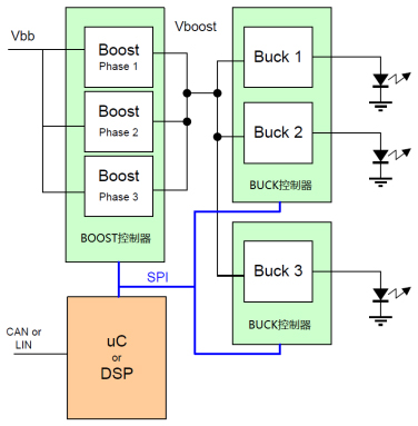 LED工作過程中,發熱量大,溫度影響著它的各個參數,這就要求LED驅動應該使用恒流源。實際應用中,不同的LED有著不同的參數,再加上不同照明方式的設計要求,很難找到一個通用的設計方案去匹配。安森美為車用大電流的LED驅動提供完整的解決方案,使用的是BOOST-BUCK的拓撲,并且各器件參數均可通過編程配置,如圖 2所示,先升壓后降壓,可滿足各種不用應用的設計,特別是汽車前照燈方面。