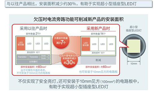以往的產品如果要實現欠壓工況下電流旁路功能,除了常規搭載的線性LED驅動器以外,還需要額外在PCB板上配置一些分立的元器件,這樣總的元器件數目會達到21個,總的PCB板安裝面積為83平方毫米。葛家明做了個對比:“采用BD18336NUF-M以后,總元器件數目可以減少7個,總的安裝面積可以控制在60平方毫米之內,比以往的設計方案節約了30%的安裝面積,很容易安裝在10mm×10mm插座型很細小的PCB板上。”