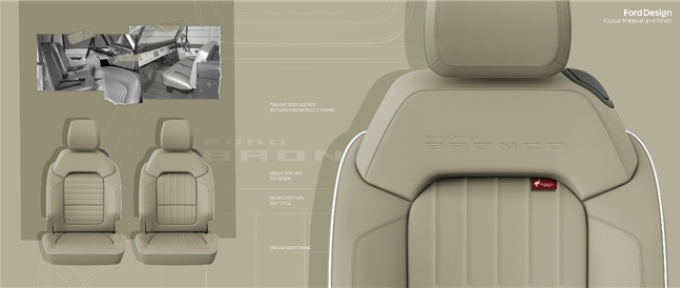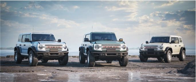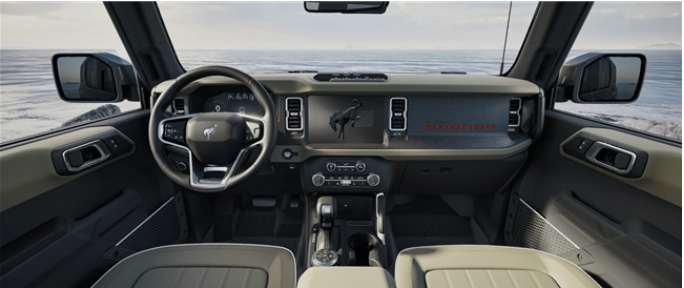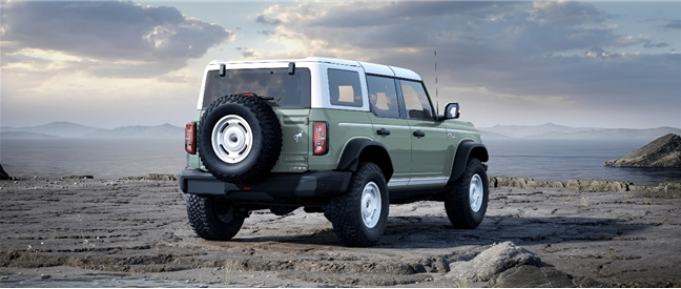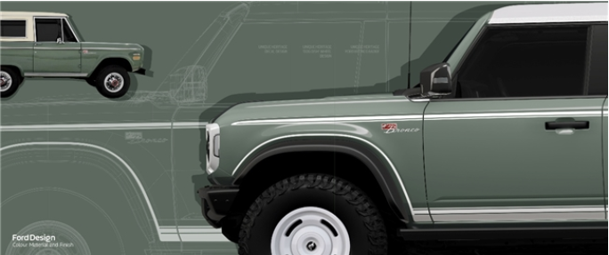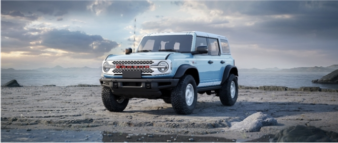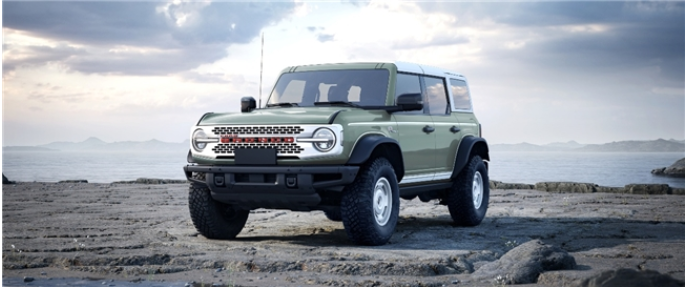 作為以獨特方式紀念原始設計的點睛之筆,車輛前翼子板兩側特別鑲嵌著初代復刻“Bronco”傳奇徽標,原版斜體鍍鉻樣式,強調出品牌的卓越品質,亦致敬福特烈馬不朽傳奇。