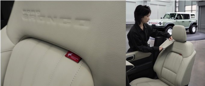 座椅的設計靈感源自初代福特烈馬,采用了垂直絎縫工藝,并在座椅邊緣使用定制牛津白(Oxford White)皮料緄邊包覆,營造出濃郁的復古氣息。座椅上一枚定制紅色刺繡標牌,更添手工定制般的細膩質感,彰顯對工藝的執著和匠心承諾。