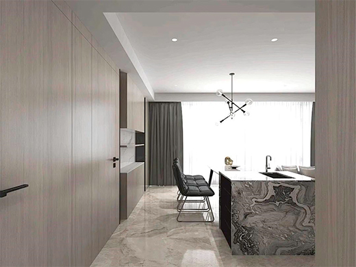 工藝上,采用歐洲環保水性油墨Arcolor,全自動光感對色系統,完美還原設計,同步對紋壓貼工藝及一板到底的飾面技術,也讓板材紋理更加細膩清晰,觸感更加真實,整體讓空間更有范。