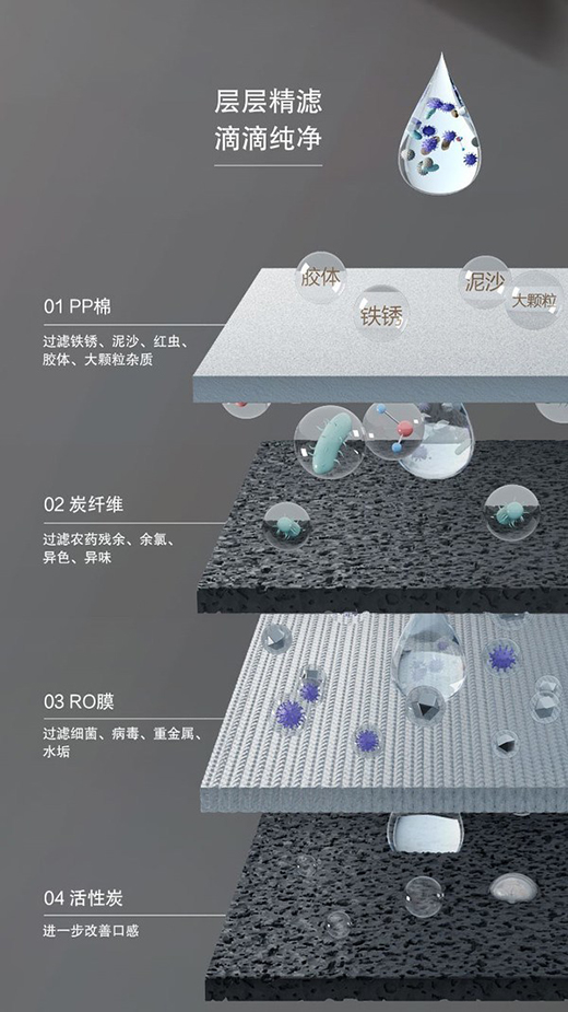 凈水,濾芯是重中之重。新品采用雙濾芯結構,雙重保證飲用水的純凈:原裝進口的杜邦反滲透濾芯,能夠有效去除水中重金屬、細菌、病毒等有害物質,凈化效果可達0.0001微米;多合一復合濾芯,集成PP棉、炭纖維、活性炭棒,實現三層凈化,重金屬、揮發性有機物的去除率可高達99.9%。雙濾芯相互配合,以四層凈化的高精度過濾效果,有效回應消費者對于飲用水的健康衛生需求。